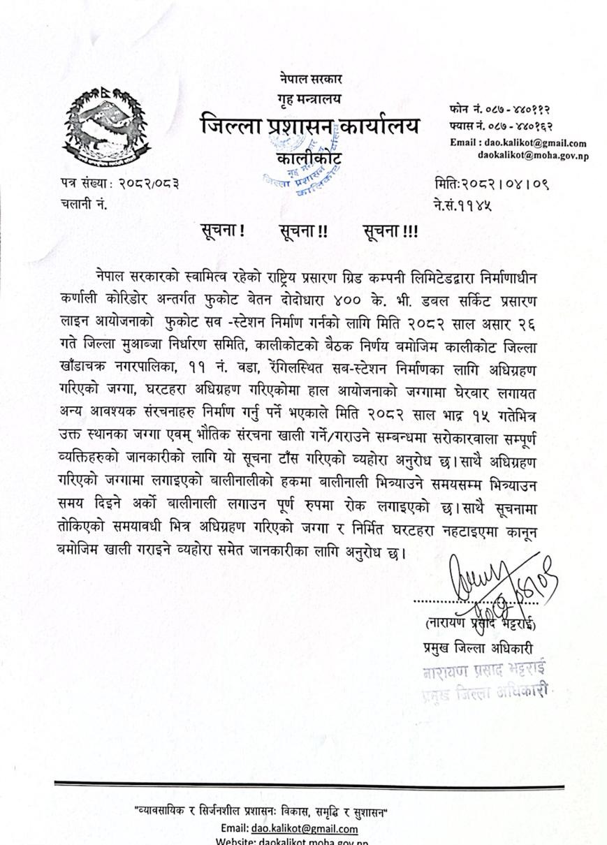 रिङ्गेल सवस्टेशनको जग्गा एवंम भौतिक संरचना खालि गर्ने गराउने सम्बन्धी सूचना