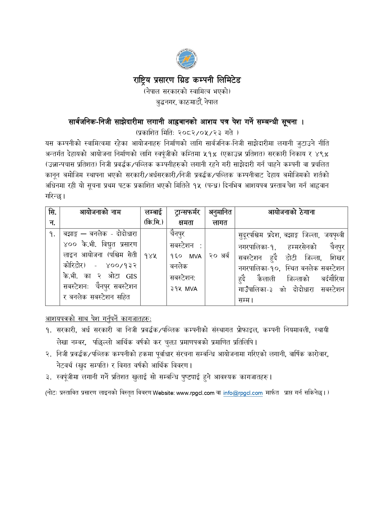 The development of transmission line system is inevitable to develop the hydropower projects in order to address the energy crisis of Nepal. In this context, Rastriya Prasaran Grid Co Ltd (RPGCL) was established by the Government of Nepal on 12 July 2015 to transmit and evacuate the power for the development and operation of the hydropower sector. The Company's corporate office is located at Kathmandu.